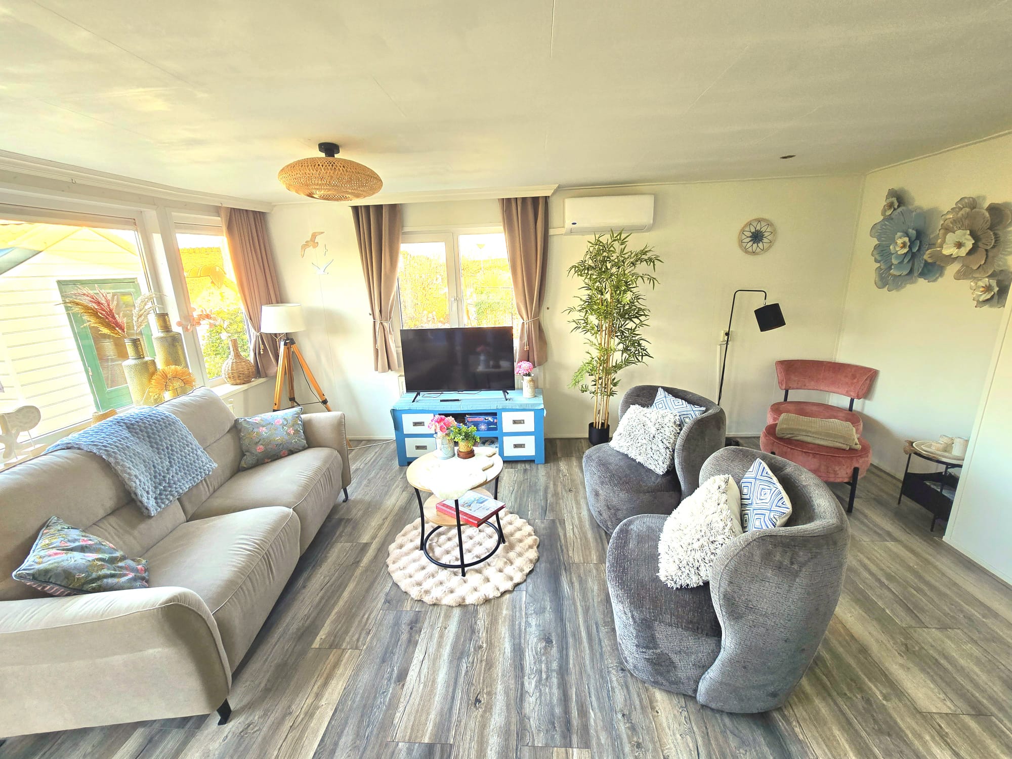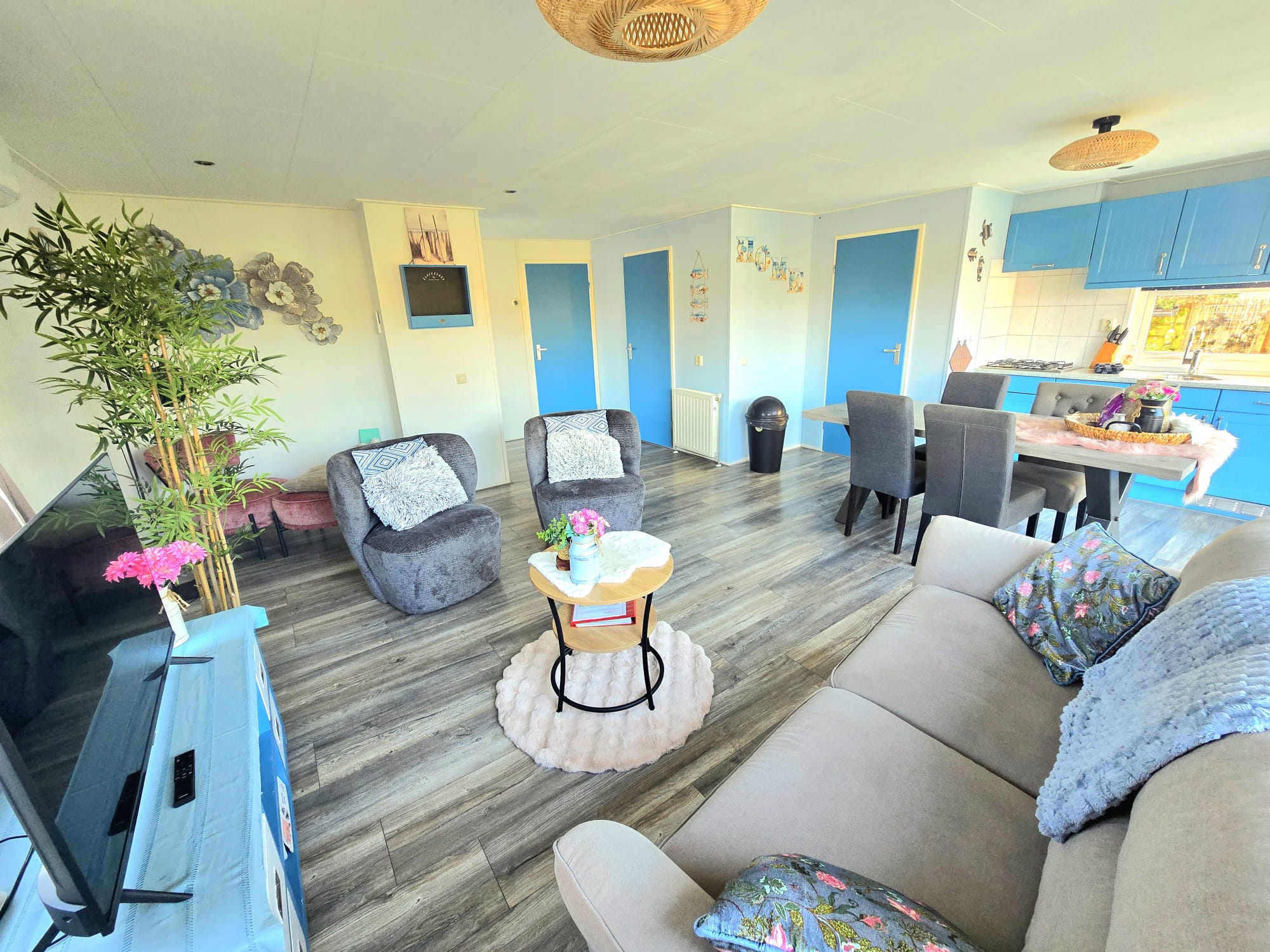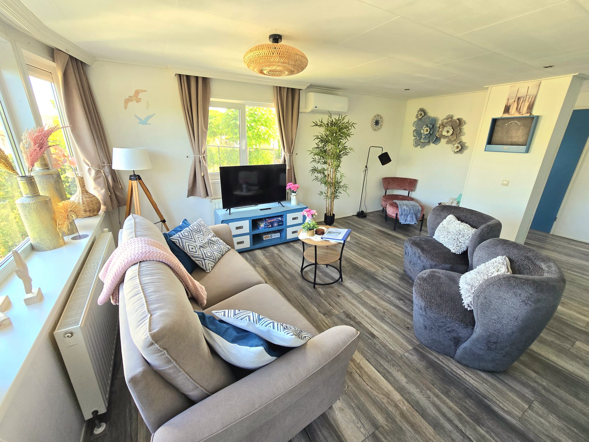 Er is genoeg zitruimte in de woonkamer en gezellige eethoek. De badkamer is voorzien van bubbelbad/douche inclusief sfeervolle verlichting, toilet en badmeubel. De keuken is uitgerust met koelkast, combi-magnetron, vaatwasser, koffiezetapparaat, waterkoker, broodrooster, Senseo, 4-pits gasfornuis. Diepvries, stofzuiger, wasmachine, droger en droogrek aanwezig.