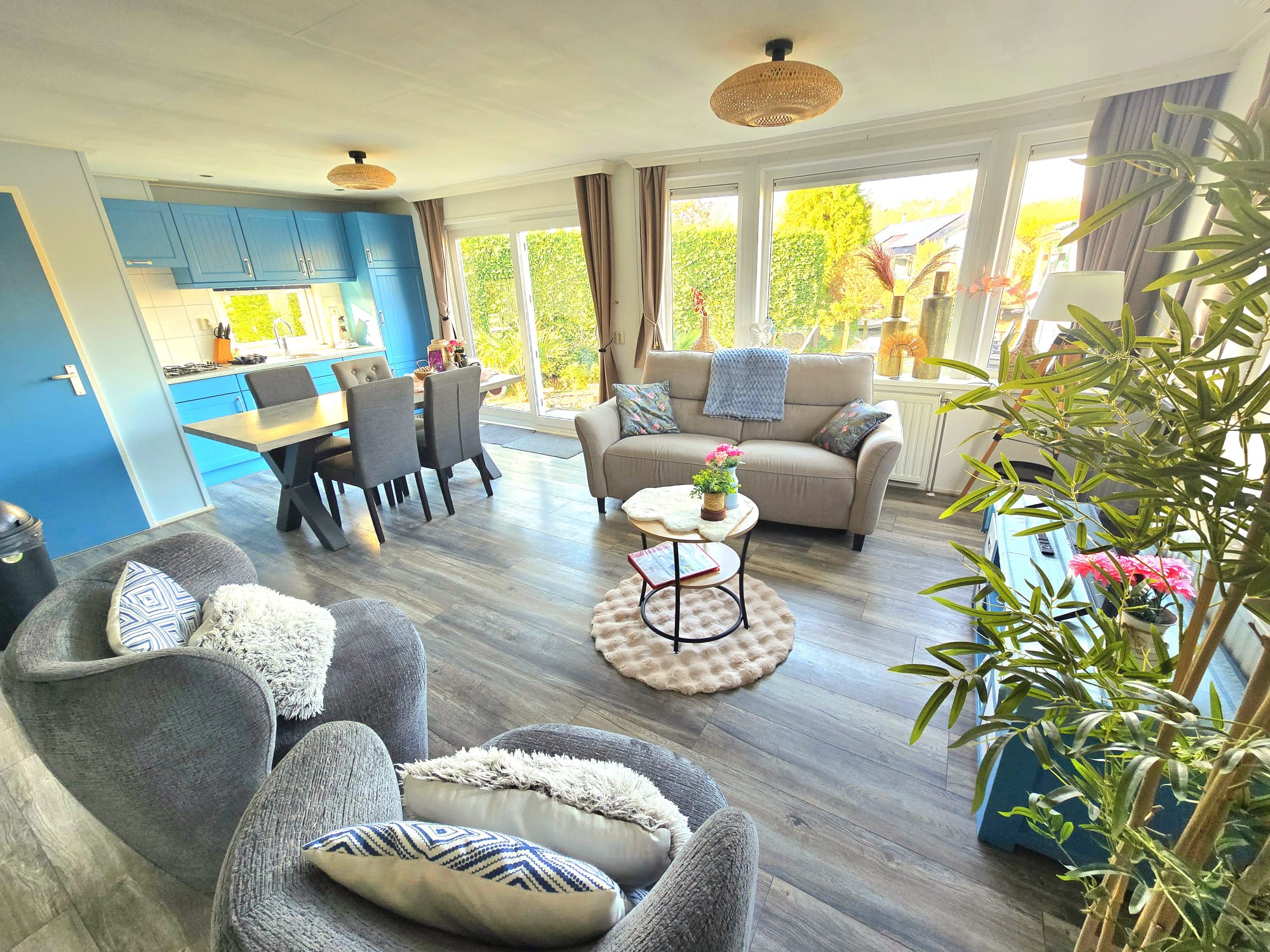 Er zijn buiten meerdere tuinsets met kussens aanwezig, deze kunt u plaatsen zo u zelf wilt.