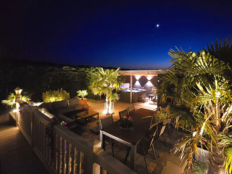 Na een saunabezoek of een dag aan zee kunt u hier heerlijk ontspannen en afkoelen. In de avond zorgt sfeervolle tuinverlichting voor een extra gezellige vakantiesfeer.