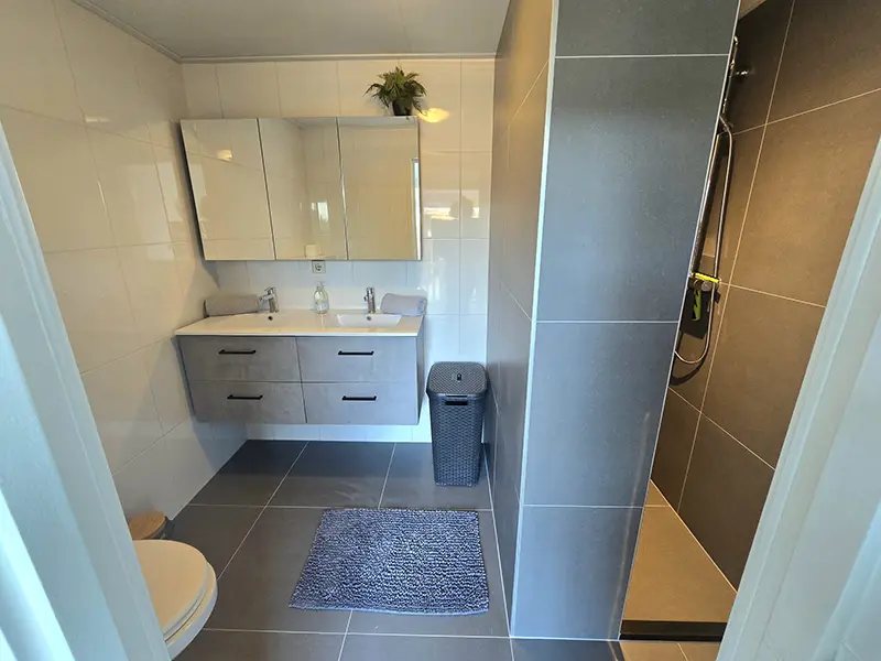 De moderne badkamer is voorzien van een heerlijke douche, dubbele wastafel en toilet. Een fijne plek om u na een dag strand, wandelen of fietsen weer op te frissen.