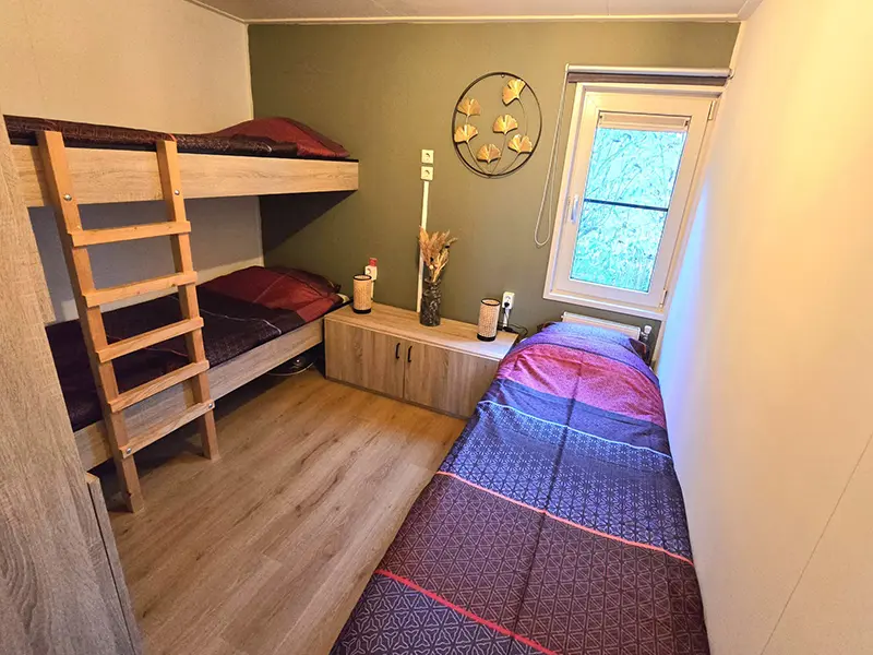 slaapkamer 2 met stapelbed en eenpersoonsbed met kastruimte
