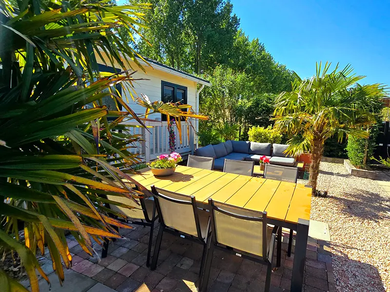 De volledig omheinde tuin biedt veel privacy en is een heerlijke plek om te ontspannen. Twee mooie palmbomen zorgen voor een verrassend tropisch vakantiegevoel, midden in Zeeland.