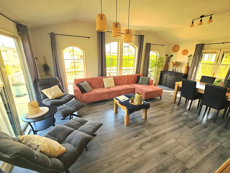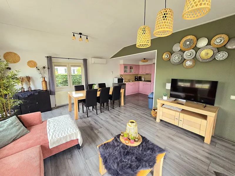 Binnen voelt het chalet direct warm en gezellig aan. In de woonkamer staat een royale loungebank waar u heerlijk kunt ontspannen na een dag buiten.